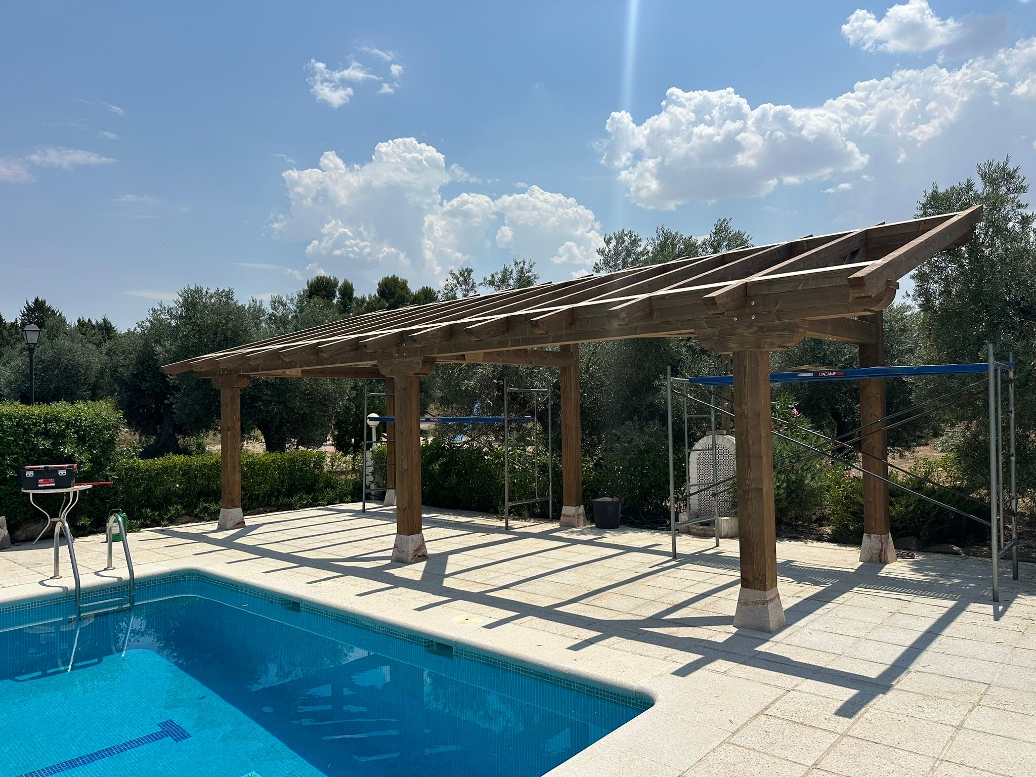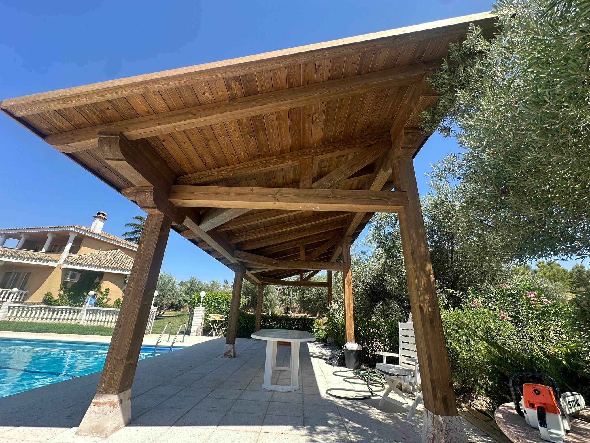 Desarrollo de pérgolas de madera subyacente con cubierta de pico realizadas en Almería para todo el dominio español.